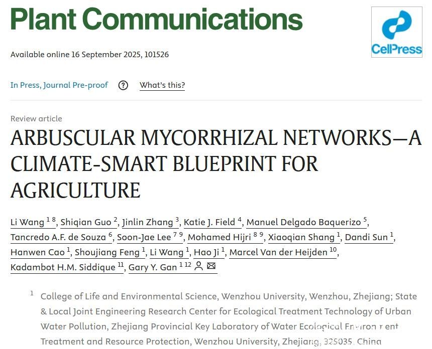 近日,澳门银河官网 生命与环境科学学院甘延太团队联合国际多所高校科研人员,在Cell Press期刊《Plant Communications》(中科院一区TOP,影响因子11.4)发表题为 “Arbuscular mycorrhizal networks — a climate - smart blueprint for agriculture”的论文,该研究系统阐述了丛枝菌根真菌(AMF)在提升农业生态系统韧性、减少化学投入、增强土壤健康等方面的多重功能,并提出以AMF为重要因子的“微生物驱动型农业”新模式,为全球可持续生态农业提供了理论依据与技术蓝图。