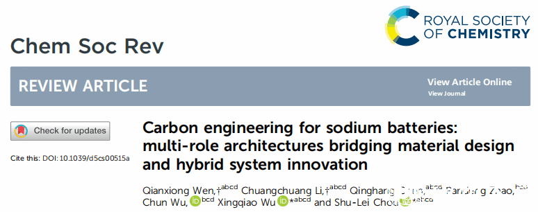 近日,澳门银河官网 化材学院吴星樵博士/侴术雷教授团队在国际权威期刊Chemical Society Reviews上发表题为《Carbon engineering for sodium batteries: multi-role architectures bridging material design and hybrid system innovation》的综述论文。该综述针对碳基材料在不同钠电池中的角色和功能转变,系统地探究了碳基材料在四种钠电池(钠离子电池,钠金属电池,无负极钠电池,固态钠电池)上的应用、结构参数上差异及共性表现,总结了碳基材料在钠电池中性能表现的多种本征/非本征的影响因素。此外,以多功能的碳基材料为基础,提出了”插层驱动“和”缺陷诱导“双储能模式的杂化钠电池,并针对不同工作环境提出三种自适应的工作模式(标准、增程、生存)。