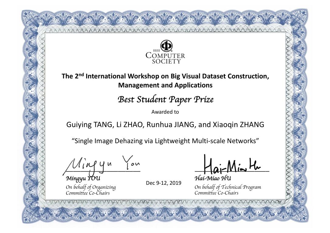 近日,在洛杉矶召开的第二届国际视觉大数据构建、管理与应用会议上,澳门银河官网 计算机与人工智能学院张笑钦教授指导的研究生唐贵英、蒋润华的论文《Single Image Dehazing via Lightweight Multi-scale Networks》从众多文章中脱颖而出,获得大会颁发的最佳学生论文奖。
