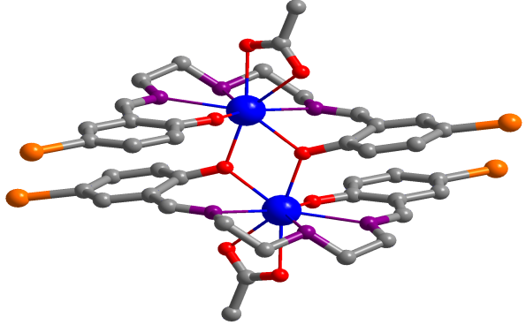 化材学院2017级化学专业本科生袁碧晨在课题组前期实验研究的基础上,合成了2个新的含(CH2)2NH(CH2)2骨架的柔性席夫碱配体。利用这两个具有良好配位性能的柔性配体,合成了2个单核稀土配合物[LnL1(NO3)(H2O)DMF] (Ln = Nd (1) and Yb (2))和2个双核稀土配合物[Ln2(L2)2(OAc)2] (Ln = Nd (3) and Yb (4))。通过X-射线晶体学手段确定了这四种配合物的晶体结构。席夫碱配体在配合物1-4中呈“折叠”结构,其官能氮、氧原子与稀土离子配位。席夫碱配体的长度约为18 Å,有助于形成大尺寸金属配合物。有趣的是,双核配合物3和4具有纳米尺寸结构,它们的分子大小约为7 × 11 × 16 Å。能量色散X射线光谱分析表明,它们的Nd:Br:O摩尔比与晶体结构一致。发光性能研究表明,这些配合物中的席夫碱配体能有效地将能量转移给稀土离子,使它们显示出稀土离子的近红外发光。同时,研究表明,由于具有较高的分子内传能效应,配合物3和4的近红外发射量子产率分别高于配合物1和2。该研究对如何通过设计合成新的柔性有机配体,达到调控不同稀土配合物结构及性能的目的,具有较好的理论指导意义。相关结果在国际期刊Journal of Rare Earths(SCI二区期刊,DOI:10.1016/j.jre.2019.02.014,2020,38,143-147)上发表。