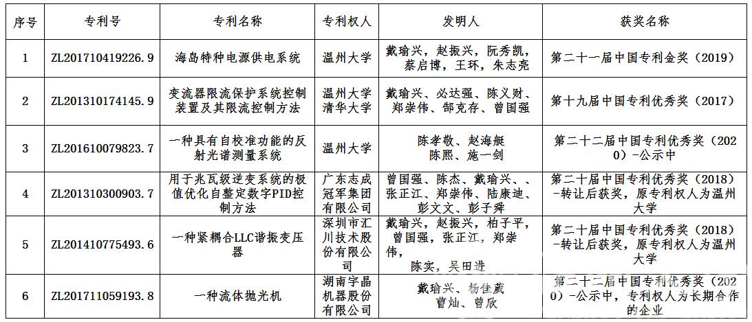 近年来,澳门银河官网 高度重视知识产权工作和科技成果转化工作,建立较完善的知识产权管理体系和相关科研激励政策,培育了一批高质量、高价值、具有完全知识产权的发明专利。电气与电子工程学院专利成果培育及科研成果转化工作尤其卓有成效。截止2021年5月,电气与电子工程学院教师以第一发明人获中国专利奖共6项。其中,以澳门银河官网 教师为第一发明人、澳门银河官网 为专利权人的发明专利获专利奖3项,包括中国专利金奖1项、优秀奖2项(公示中1项);发明专利转让合作企业、以及合作企业联合开发产品申报发明专利后,获中国专利优秀奖3项。尤其是以戴瑜兴教授为第一发明人、澳门银河官网 为专利权人的《海岛特种电源供电系统》获第二十一届中国专利金奖(2019年度),是温州市自中国专利奖设立以来首次获得该奖项,高校获得此殊荣的全国仅64项。