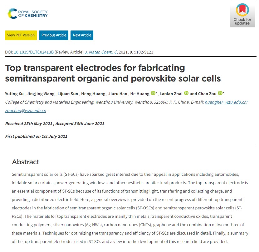 近日,澳门银河官网 2019级材料科学与工程专业硕士研究生许宇婷在权威期刊Journal of Materials Chemistry C上发表题为Top transparent electrodes for fabricating semitransparent organic and perovskite solar cells(顶部透明电极在制备半透明有机和半透明钙钛矿太阳能电池方面的应用)的综述论文,通讯作者为邹超教授和黄合博士。