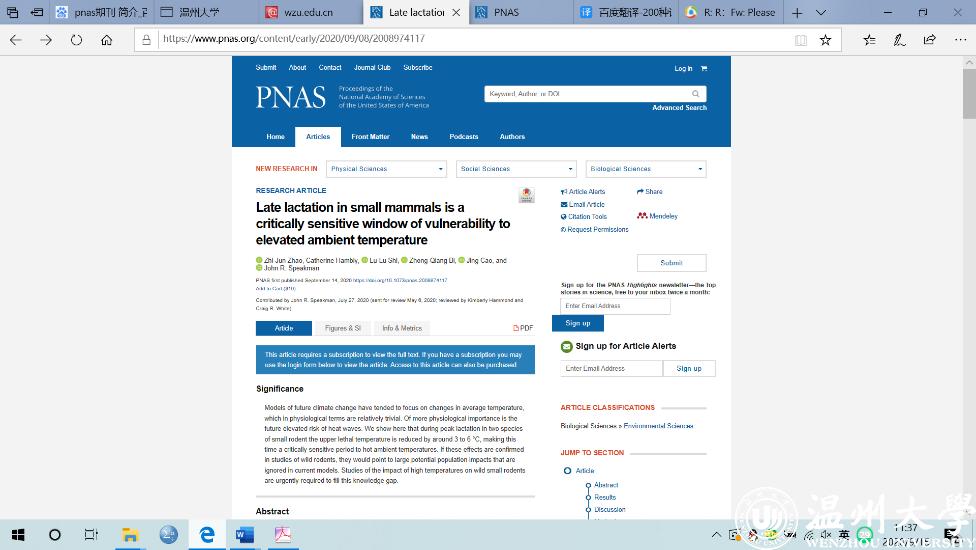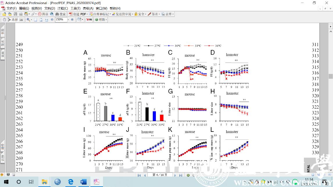 2020年9月14日,澳门银河官网 生命与环境科学学院赵志军教授课题组、中科院遗传与发育生物学研究所John Speakman教授和Aberdeen University of UK的Catherine Hambly博士,联合在国际学术期刊《美国科学院院刊》(Proceedings of the National Academy of Sciences of the United States of America,PNAS)在线发表题为“Late lactation in small mammals is a critically sensitive window of vulnerability to elevated ambient temperature”的研究论文(//doi.org/10.1073/pnas.2008974117)。《美国科学院院刊》自1914年创刊,是国际上最负盛名的基础科学领域的学术杂志之一,收录的论文涵盖生物、物理和社会科学。