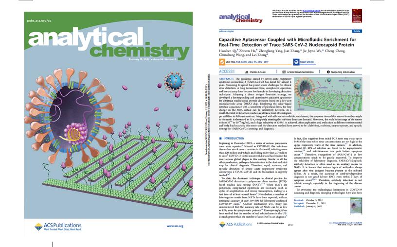 近日,澳门银河官网 电气与电子工程学院张鉴教授课题组以“Capacitive Aptasensor Coupled with Microfluidic Enrichment for Real-Time Detection of Trace SARS-CoV‑2 Nucleocapsid Protein”为题在《Analytical Chemistry》发表研究论文,并被期刊选为supplementary cover亮点报道。