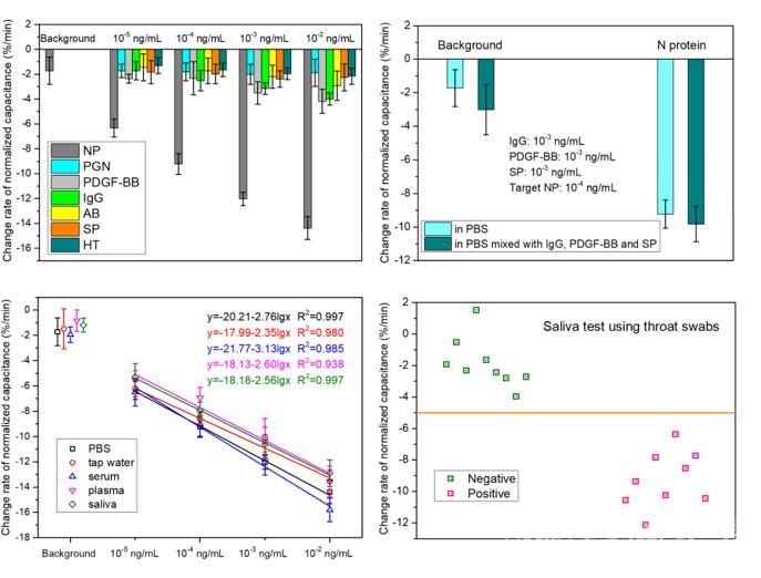 澳门银河官网 电气与电子工程学院张鉴教授课题组基于微流控富集和核酸适配体特异性识别机制,以病毒的核衣壳蛋白(N蛋白)为抗原,利用微加工传感器的pF级界面电容感应原理,实现了一种低成本、非标记、非测序的痕量新冠病毒标志物检测芯片及检测策略。N蛋白作为SARS-CoV-2的一种重要结构蛋白,在病毒RNA的组装和释放中起着关键作用,是一种理想的检测靶标。通常的抗原检测方法对痕量蛋白依赖额外的预富集装置及步骤,不易实现实时检测。课题组利用交流介电泳力驱动,在15秒内完成超痕量N蛋白的富集,同时巧妙利用界面电容变化率,在同一过程中完成传感信号读出。该传感器的检出限低至10-6ng/mL,较之大部分已报道结果低4个数量级,线性范围为(10−5~ 10−2)ng/mL,检测时间为15秒钟。课题组利用该传感器对血清、血浆、唾液、环境水等多种基质中的N蛋白进行了成功检测。