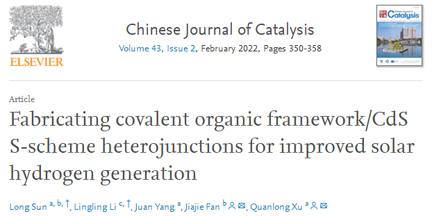 近期,澳门银河官网 徐全龙副教授在国际著名期刊《Chinese Journal of Catalysis》上发表了题为”Fabricating Covalent organic framework/CdS S-scheme heterojunctions for improved solar hydrogen generation”的研究论文。该工作利用对环境友好、可见光吸收强、能带结构合适、比表面积较大的COF-LZU1与具有空心立方结构的CdS复合,制备出COF/CdS异质结光催化剂,在可见光下表现出良好的光催化析氢性能。当异质结中COF质量含量达到1.5%时,具有最高的产氢速率,为8670 μmol·h−1·g−1,是纯CdS的2.1倍,且在420 nm单色光照射下的表观量子效率为8.9%。