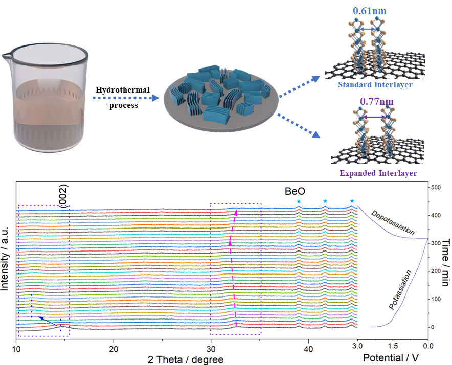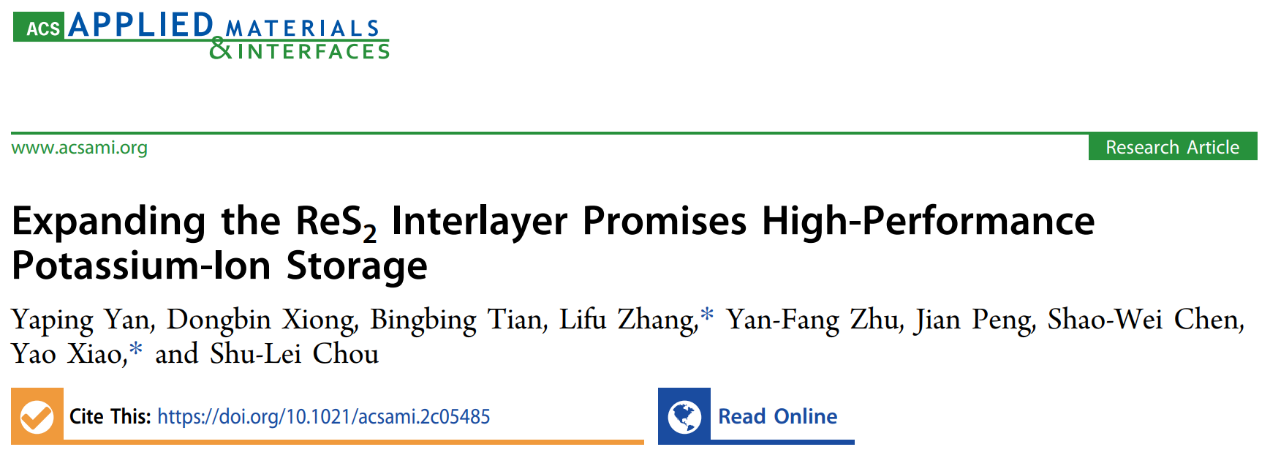 然而,目前报道的ReS2电极材料表现出的较差的动力学离子扩散和循环稳定性,尤其是在高电流密度下的电化学性能。为了解决上述关键核心问题,近日,澳门银河官网 化材学院碳中和技术创新研究院肖遥团队在国际权威期刊《ACS Applied Materials & Interfaces》(//pubs.acs.org/doi/abs/10.1021/acsami.2c05485)上发表题为“Expanding the ReS2 Interlayer Promises High-Performance Potassium-ion Storage”的研究论文。本文利用二维层状材料的特点,采用二维材料层间距扩大的策略,通过简单的水热法,在还原氧化石墨烯(rGO)表面上合成了扩层的ReS2纳米片。所制备的ReS2纳米片的层间距为~ 0.77 nm,远大于扩层前的0.61 nm。采用原位XRD技术研究了ReS2在钾离子电池中的离子存储机制,揭示了钾离子在扩层ReS2中嵌入和转换两种混合的模式。扩层的纳米复合材料在0.05、0.2和1.0 A/g电流密度下表现出432.5、316.5和241 mAh/g的高比容量,并在1A/g的电流密度下,表现出优异的可逆性。总体而言,这种材料局域化学策略也为其他材料的开发应用提供了新的借鉴。