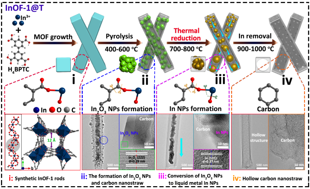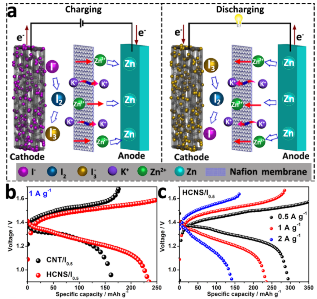 近日,澳门银河官网 钱金杰课题组通过对In-MOF热裂解过程中配体脱羧和氧化铟纳米颗粒氧化还原反应的调控,进而形成的液态金属铟通过熔聚和重力作用从碳纳米内腔中聚集流出形成空腔,从而获得中空结构的多孔碳材料(HCNS)。这种纳米秸秆形状的HCNS催化剂具有远高于CNTs的电化学交换能力。HCNS具有更多的电荷活性位点、短而快速的电子和离子传输途径,以其独特的内腔和管壁上相互连接的多孔结构,成功获得新一代高性能理想正极材料。其中,HCNS/I0.5展现出优于商业CNTs材料的高比容量(484.9 mAh g-1@1 A g-1)和较好的倍率性能。在此基础上组装的锌碘电池在1 A g-1时提供了246.6 mAh g-1的高容量,保证了电解液中碘物质的吸附和溶解平衡,极大地提高了该电池的倍率和循环性能,从而获得了优异的容量保持率。