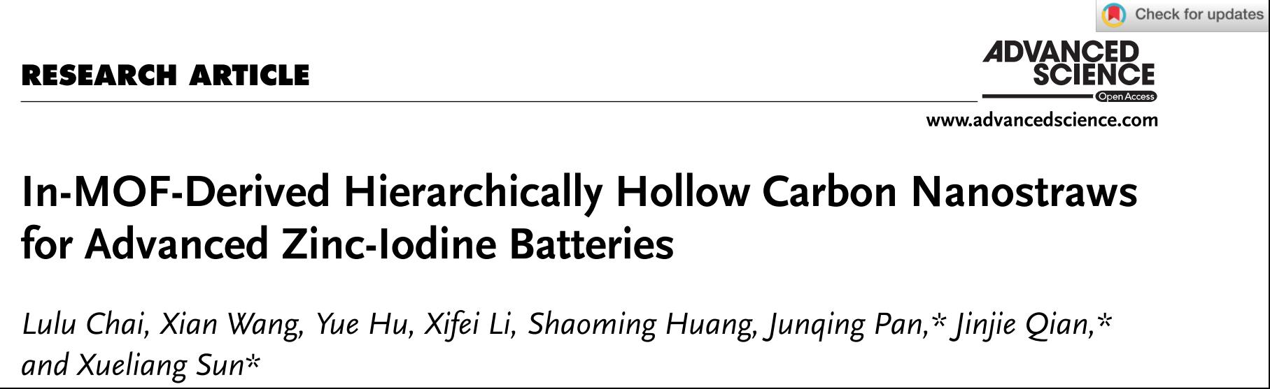 因此,本研究工作为锌离子电池和锂离子电池等高比能量二次电池的未来发展提供一种通用多孔的中空碳材料载体的可控制备策略。这一研究结果以“In-MOF-Derived Hierarchically Hollow Carbon Nanostraws for Advanced Zinc-Iodine Batteries”为题发表在《Advanced Science》,澳门银河官网 作为第一通讯单位,2020届研究生柴路路为第一作者,澳门银河官网 钱金杰副教授、北京化工大学潘军青教授和加拿大西安大略大学孙学良院士为共同通讯作者,该工作得到国家自然科学基金(21601137)、中国科学院结构化学国家重点实验室(20190008)、温州市基础科学研究项目(G20190007,ZG2017027)、澳门银河官网 研究生科研基金(316202001022)的资助。