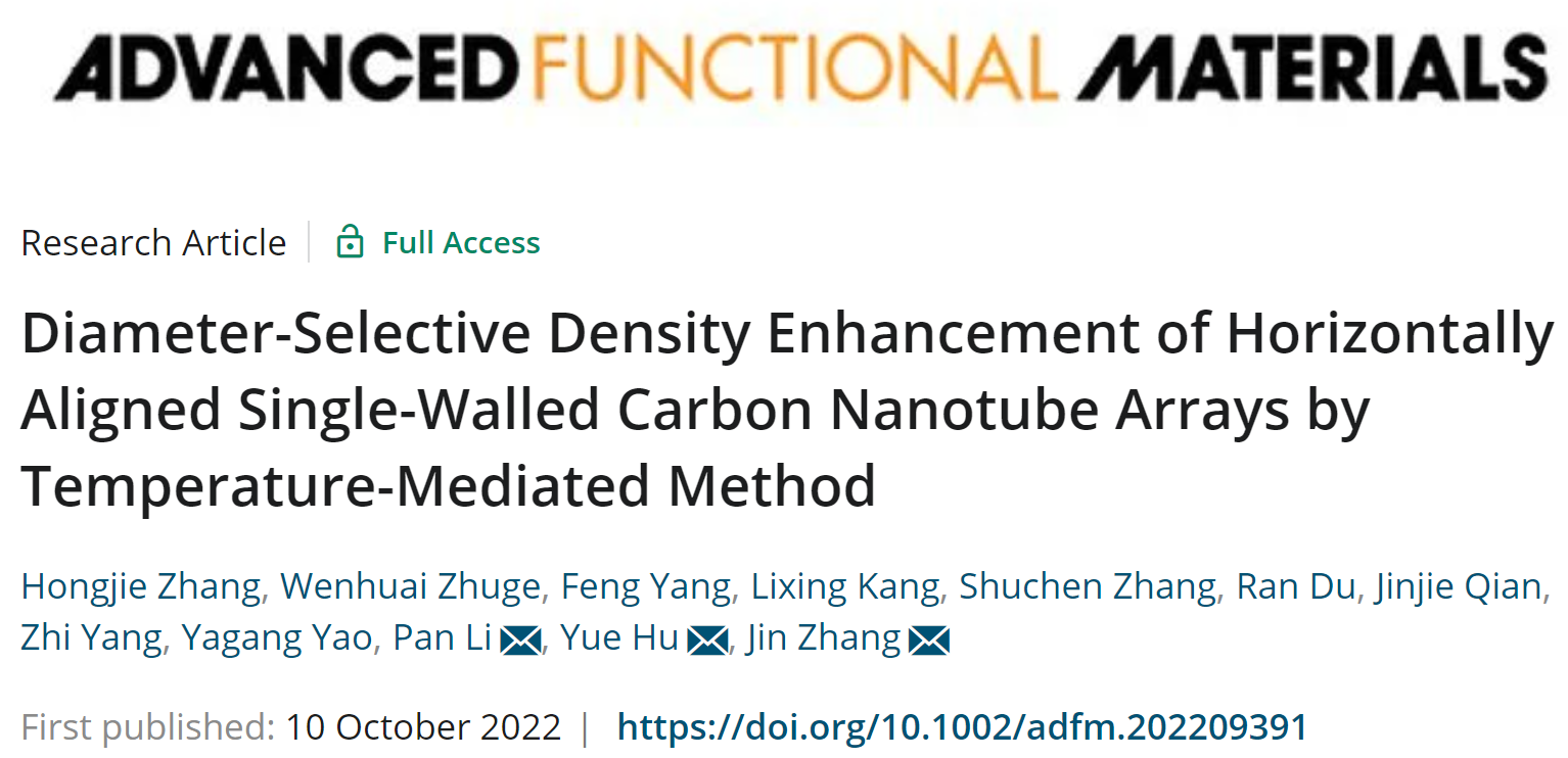 近日澳门银河官网 化材学院胡悦特聘教授团队联合南京邮电大学李盼副教授、北京大学张锦教授在控制制备高密度单壁碳纳米管(SWNT)方面取得新进展,开发了一种简单且新颖的温度扰动策略以制备具有管径选择性的高密度SWNT阵列,为SWNT在纳电子器件方面的提供了理想平台。相关成果以标题“Diameter-Selective Density Enhancement of Horizontally Aligned Single-Walled Carbon Nanotube Arrays by Temperature-Mediated Method”(DOI:10.1002/adfm.202209391)发表在Advanced Functional Materials。该工作通过调节温度对金属催化剂容碳量进行调控,再活化具有特定尺寸的因被碳包覆而失活的催化剂,使其继续催化生长特定管径的SWNT。最终使得在石英基底上获得的SWNT阵列的密度增加了三倍以上,且管径分布控制在2纳米左右。并通过环境透射电子显微镜对催化剂再活化过程进行原位研究,为催化剂效率的提高提供了关键性的见解。使用获得的SWNT阵列制作场效应晶体管器件,该器件表现出非常优秀的载流子迁移能力,表明所获得的SWNT阵列在纳电子器件中的应用潜力。澳门银河官网相关的文章发表在Advanced Functional Materials上,澳门银河官网 为第一通讯单位,澳门银河官网 化材学院2019级研究生张红杰为第一作者,化材学院胡悦特聘教授、南京邮电大学李盼副教授及北京大学张锦教授为共同通讯作者。相关工作受到国家自然科学基金和浙江省自然科学基金项目的资助。
