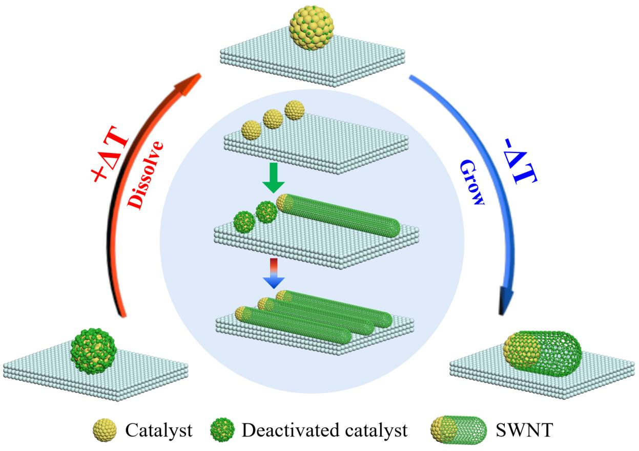 图1.用温度扰动法在石英基底上生长水平排列的SWNT阵列示意图