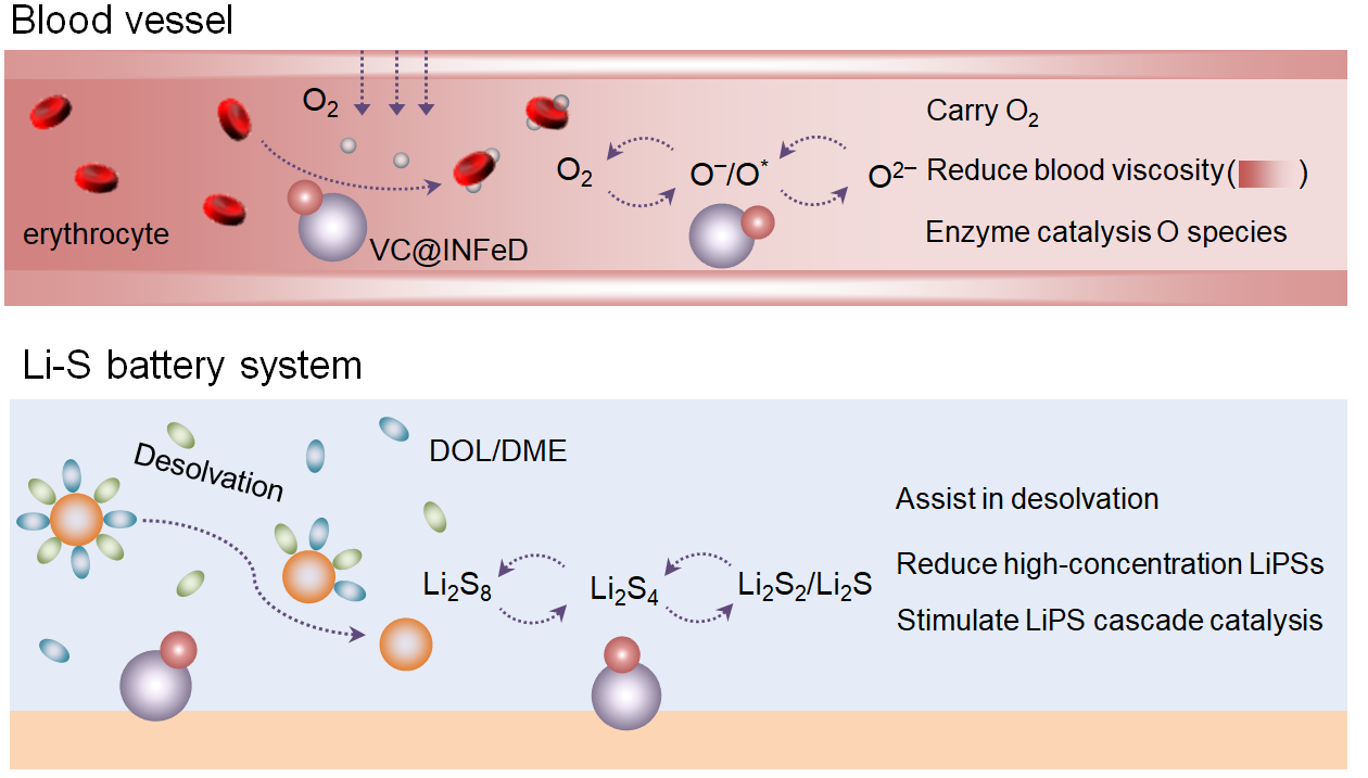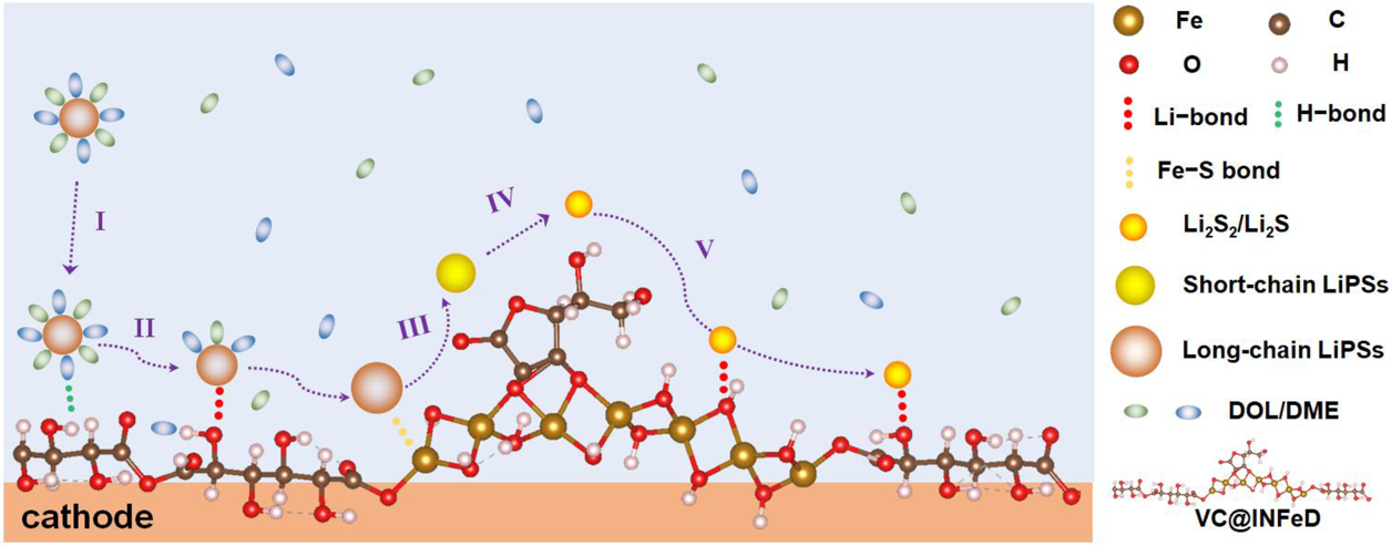在此,受右旋糖酐铁(INFeD)和抗坏血酸(VC)联合作为治疗贫血的补血药启发,澳门银河官网 杨植教授、蔡冬博士与杨硕博士联合开发了一种高效的VC@INFeD硫正极催化剂,在多重H/Li键的协助下,溶剂化的多硫化锂(LiPSs)在正极/电解质界面上可通过具有梯度吸附能力的羟基基团完成富集和脱溶化,随后在INFeD链上完成转移,进而在VC@INFeD级联催化位点实现其彻底转化。结果表明,INFeD主要促进长链LiPSs的转化,VC加速短链LiPSs的转化,两者协同可以显著降低每个硫氧化还原步骤的能量势垒,并赋予锂硫电池优异的电化学性能。即使在高硫含量(5.2 mg cm‒1)和贫电解质(E/S,~7μL mg−1)条件下,也具有高硫利用率和良好的循环稳定性。