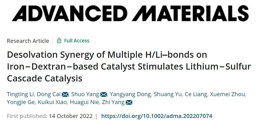 因此,本研究以“Desolvation Synergy of Multiple H/Li–bonds on Iron−Dextran−based Catalyst Stimulates Lithium−Sulfur Cascade Catalysis”为题发表在材料领域顶级期刊《Advanced Materials》。澳门银河官网 作为第一通讯单位,2020级研究生李婷婷为第一作者,澳门银河官网 化学与材料工程学院杨植教授、蔡冬博士和电气与电子工程学院杨硕博士为共同通讯作者,澳门银河官网 聂华贵教授、葛勇杰博士、肖逵逵博士、周学梅博士、硕士生梁策、于爽同学以及首届博士生东洋洋同学参与了这项工作。该工作得到国家自然科学基金、浙江省自然科学基金的部分资助。