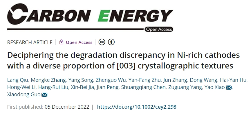 该成果以“Deciphering the degradation discrepancy in Ni-rich cathodes with the diverse proportion of [003] crystallographic texture”为题发表在高水平期刊Carbon Energy(IF: 21.556)上。澳门银河官网 化材学院肖遥教授与四川大学郭孝东教授为该论文共同通讯作者。