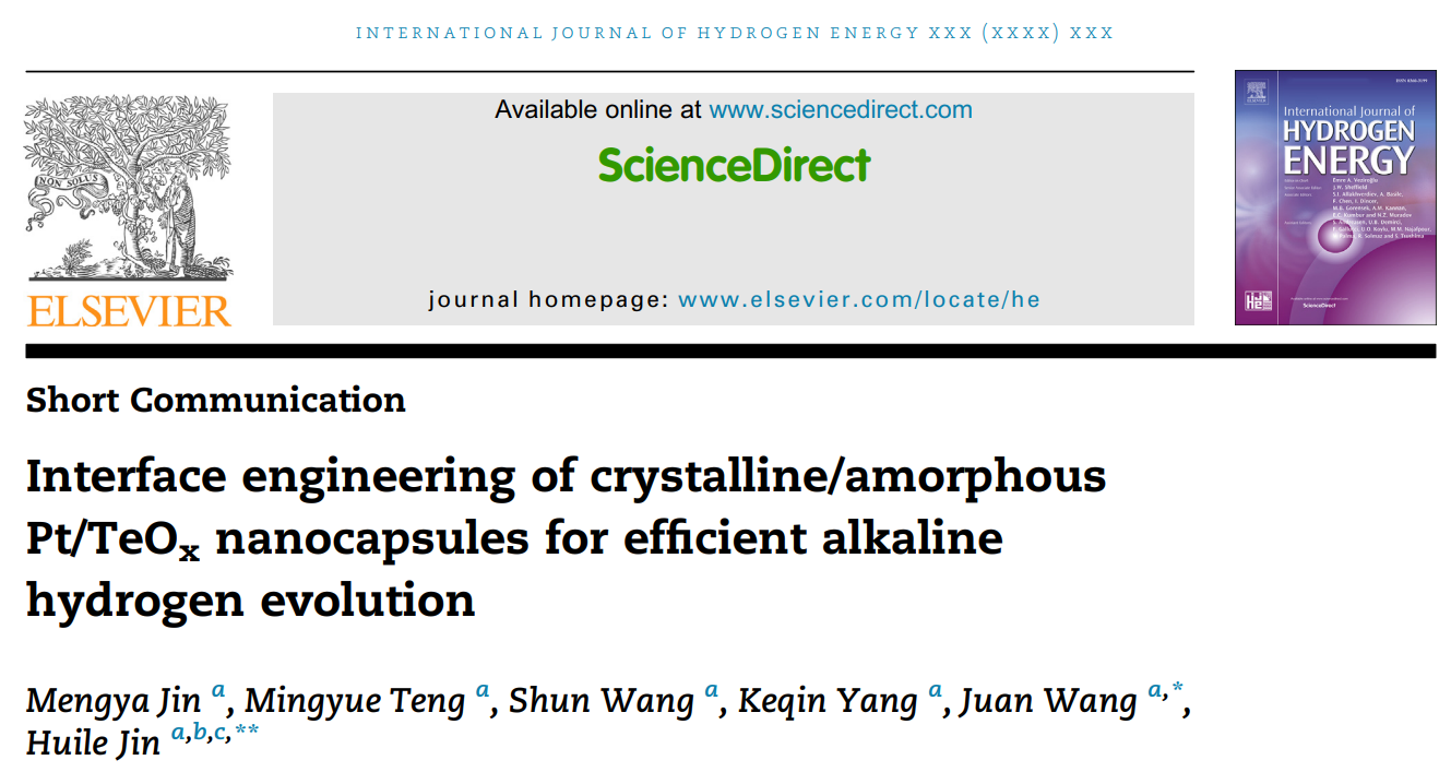 相关研究以“Interface engineering of crystalline/amorphous Pt/TeOx nanocapsules for efficient alkaline hydrogen evolution”为题发表在国际期刊《International Journal of Hydrogen Energy》(SCI-2区, IF=7.139)上,澳门银河官网 作为唯一通讯单位,我院2019级本科生金梦雅为第一作者,我院金辉乐教授、王娟副教授为本文通讯作者。