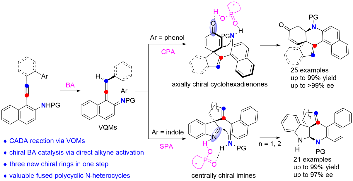 近些年来,通过活化惰性炔烃来实现炔烃催化不对称官能团化反应一直受到人们的广泛关注。与成熟的过渡金属催化这些转化相比,基于惰性炔烃活化的不对称有机催化发展相对较少。近日,澳门银河官网 钱鹏程教授课题组与厦门大学叶龙武教授课题组合作以简单易得的苯酚高炔丙胺和吲哚高炔丙胺为底物,实现了Brønsted酸直接活化炔烃并成功完成苯酚和吲哚催化不对称去芳构化反应。该反应具有如下特点:(1)实现了Brønsted酸直接活化炔烃;(2)报道了无金属参与的基于苯酚和吲哚的不对称去芳构化反应;(3)一步构建具有季碳且多立体中心的含氮杂环;(4)具有优秀的化学选择性、对映选择性和立体选择性。