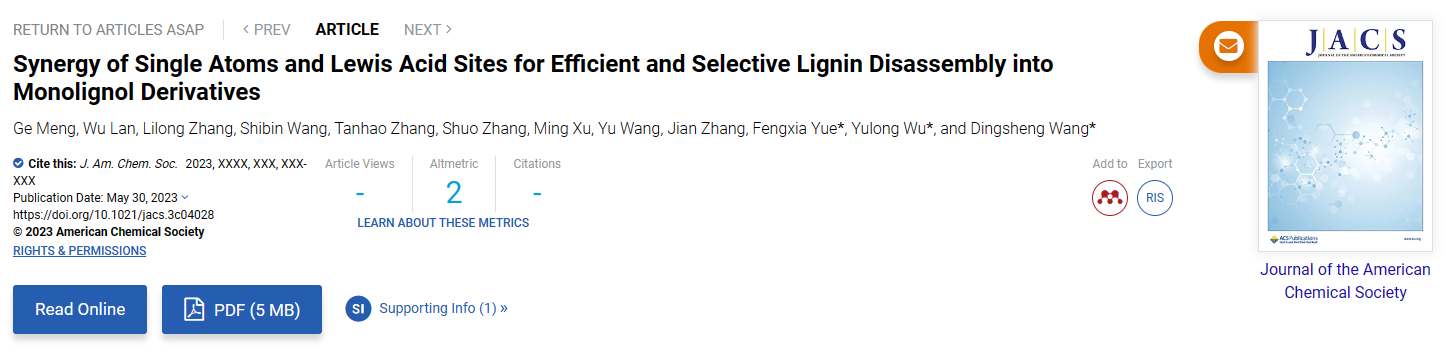 基于以上分析,澳门银河官网 孟格博士与清华大学王定胜教授、吴玉龙教授以及华南理工大学岳凤霞教授课题组合作,通过基于层状双金属氢氧化物(LDHs)的阴离子插层和二维(2D)限域策略设计合成了一种以MgO为载体且同时负载Mo单原子和Al Lewis酸性位点的多功能催化剂(Mo1Al/MgO),并将其应用在N2气氛下的桉木木质素解聚反应当中。Mo1Al/MgO催化剂对松柏醇γ甲醚和芥子醇γ甲醚的选择性达到92%,同时具有良好的循环稳定性。密度泛函理论(DFT)计算和对照实验进一步表明,在甲醇参与条件下,Mo1-O5单原子中心与邻近的Al Lewis酸位点的协同催化作用使侧链不饱和单体产物的产率和选择性大幅提高。该研究将单原子和Lewis酸位点结合起来,在更安全和更低成本的生物质催化体系中获得高附加值产品,并为生物质炼制工业的催化剂设计提供了一定的理论指导。这一成果近期发表在Journal of the American Chemical Society (DOI: 10.1021/jacs.3c04028),孟格博士为第一作者,澳门银河官网 为第一完成单位,岳凤霞、吴玉龙、王定胜为共同通讯作者。