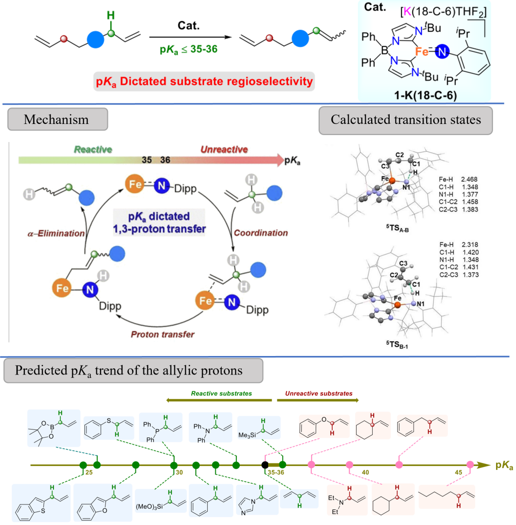 澳门银河官网 化材学院汤浩教授理论计算课题组与美国印第安纳大学化学系Jeremy M. Smith教授课题组合作报道了高自旋三配位Fe(II)亚胺配合物(1-K-(18-C-6))催化的双键转位反应,通过1,3-氢质子迁移实现了1-烯烃向2-烯烃的转化。其中,双键转位是由Fe(II)中心和碱性亚胺配体的协同作用实现。DFT计算的过渡态结构揭示了烯丙基氢直接从1-烯烃转移到亚胺配体上(5TSA-B) ,随后烯丙基C1与氨基配体上的氢结合 (5TSB-1)获得相应的产物,而Fe–H物种并未参与。底物烯丙基质子的pKa决定反应的区域选择性,而且双键转位发生的转折点在于烯丙基质子的pKa ≈ 35−36处。值得一提的是:铁催化剂的高自旋(S = 2)允许反应具有良好的官能团耐受性,包括典型毒化催化剂的位点,如胺、含N-杂环、膦化物等。