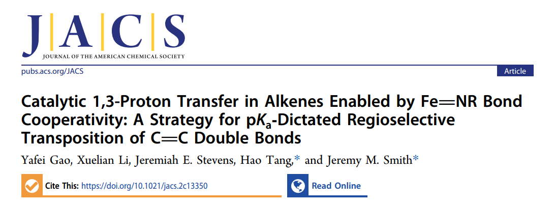 该成果以“Catalytic 1,3-Proton Transfer in Alkenes Enabled by Fe=NR Bond Cooperativity: A Strategy for pKa Dictated Regioselective Transposition of C=C Double Bonds”为题发表在国际顶级期刊《Journal of the American Chemical Society》上。汤浩教授与美国印第安纳大学化学系Jeremy M. Smith教授为该论文共同通讯作者。