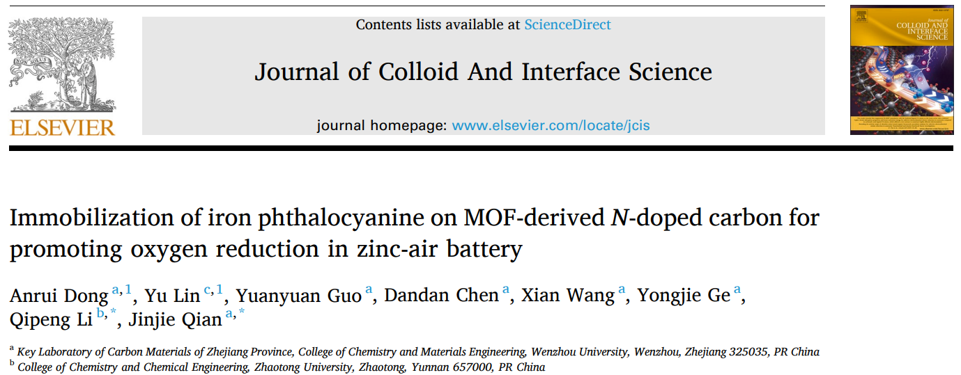 这项研究的成果题为《Immobilization of iron phthalocyanine on MOF-derived N-doped carbon for promoting oxygen reduction in zinc-air battery》,发表在《Journal of Colloid and Interface Science》(中科院1区,Top,IF=9.965)上。澳门银河官网 为第一通讯单位,澳门银河官网 化材学院2018级本科生董桉瑞为第一作者,钱金杰副研究员为通讯作者、昭通学院李启彭教授为共同通讯作者。该研究得到了国家自然科学基金(22105147,21601137)、浙江省自然科学基金项目(LQ16B010003)、浙江省温州市基础科技研究项目(H20220001, G20190007)和云南省地方本科高校基础研究联合专项资金项目(202101BA070001-042)的资助。