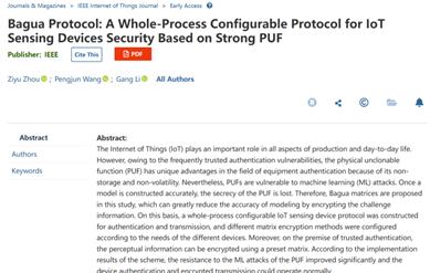 物理不可克隆函数(Physical Unclonable Function, PUF)是一种新型的硬件安全原语,通过提取集成电路制造过程无法避免引入的随机工艺偏差,可产生具有随机性、唯一性和防篡改特性的特征密钥。基于PUF的设备认证协议相较于基于传统加密和密钥管理的认证方法具有更高的安全性和鲁棒性。针对物联网设备认证协议开销与性能无法兼顾的技术瓶颈,澳门银河官网 汪鹏君教授团队提出一种面向物联网感知设备的全流程可配置安全认证协议,该协议的核心加密算子源于我国传统五子棋局八卦阵。协议针对不同设备配置不同八卦矩阵的加密方式,以提升强PUF的抗机器学习攻击能力和协议的抗重放暴力攻击能力,从而最大限度地降低敏感数据泄露的风险。通过搭建自主测试平台,验证该协议可极大提升感知设备的全流程安全,并能够优化感知层资源的分配效率。