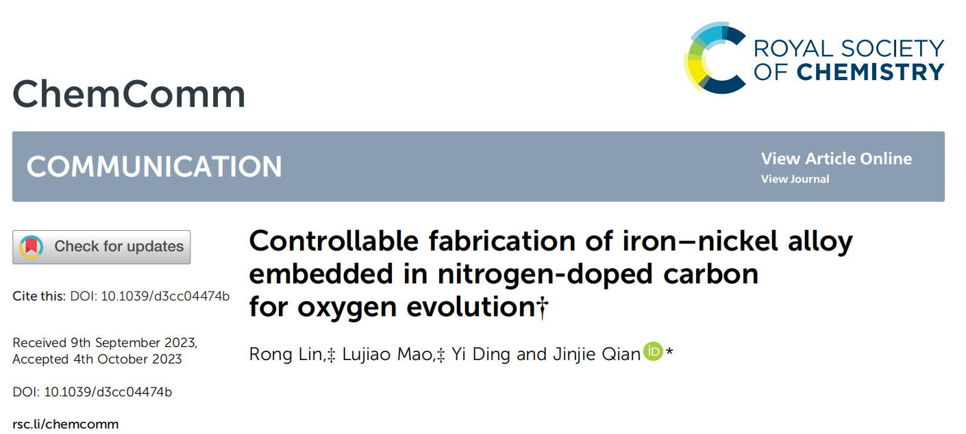 本论文以“Controllable fabrication of iron-nickle alloy embedded in nitrogen-doped carbon for oxygen evolution”为题发表在被自然指数收录的国际著名期刊《Chemical Communications》上。澳门银河官网 为第一通讯单位,澳门银河官网 化材学院钱金杰副教授为通讯作者,化材学院21级本科生林荣、21级研究生毛璐娇为共同一作,21级本科生丁奕参与了该项工作。该工作受到国家自然科学基金(21601137)、浙江省自然科学基金(LQ16B010003)、浙江省温州市基础科技研究项目(H20220001)的资助。