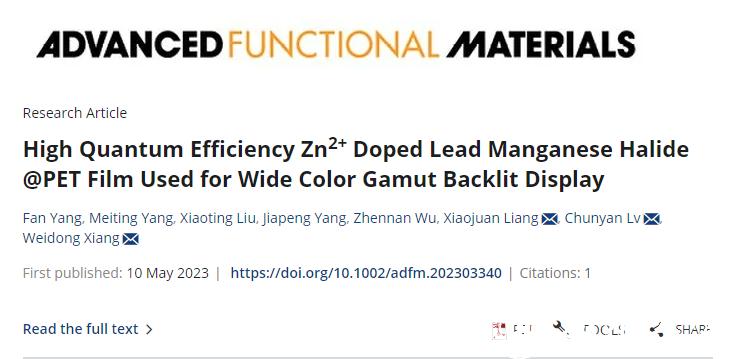 近日,澳门银河官网 生命与环境科学学院2021级硕士研究生杨凡在国际著名期刊《Advanced Functional Materials》(SCI一区TOP期刊,IF = 19)上发表题为“High Quantum EfficiencyZn2+ Doped Lead Manganese Halide @PET Film Used for Wide Color Gamut Backlit Display”的论文。