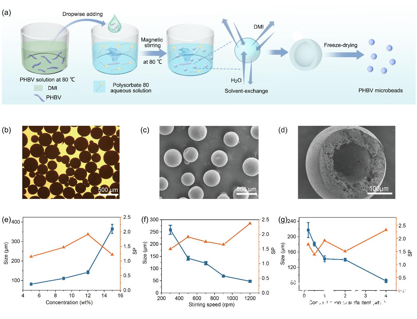 图2. PHBV微珠的制备。(a) 采用溶剂交换法制备PHBV微珠流程图;(b) PHBV微珠光学显微镜形貌表征;(c) PHBV微珠扫描电子显微镜形貌表征;(d) PHBV微珠截面内部扫描电子显微镜形貌表征;(e-g) 以不同聚合物溶液浓度、搅拌速度、表面活性剂浓度制备PHBV微珠,其粒径大小和分布的变化。SP表示粒径分布跨度,误差棒表示标准误差。