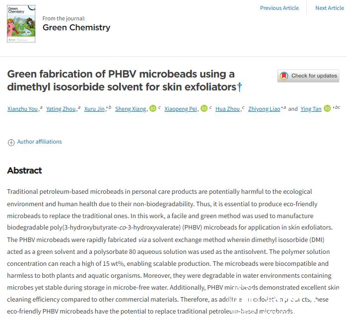 近日,我院2021级硕士研究生游仙竹同学所在的廖志勇教授课题组联合国科温州研究院谭颖研究员团队以生物基来源的异山梨醇二甲醚为绿色溶剂、聚山梨酯80水溶液为抗溶剂,采用简单的溶剂交换法绿色制备了表面光滑、内部多孔核中空的PHBV微珠(图1)。所制备PHBV微珠环境友好,具有生物相容性,对植物和水生生物无害、在水环境中可降解。此外,与商业的其他材料相比,PHBV微珠具有较好的皮肤清洁效率。因此,所制备的PHBV微珠作为添加剂用于皮肤去角质产品中,有望取代传统的塑料微珠。该研究成果以“Green fabrication of PHBV microbeads using dimethyl isosorbide solvent for skin exfoliators”为题发表于《Green Chemistry》(SCI一区TOP期刊,IF=9.8)上。