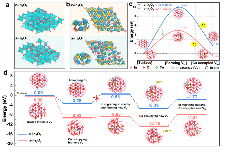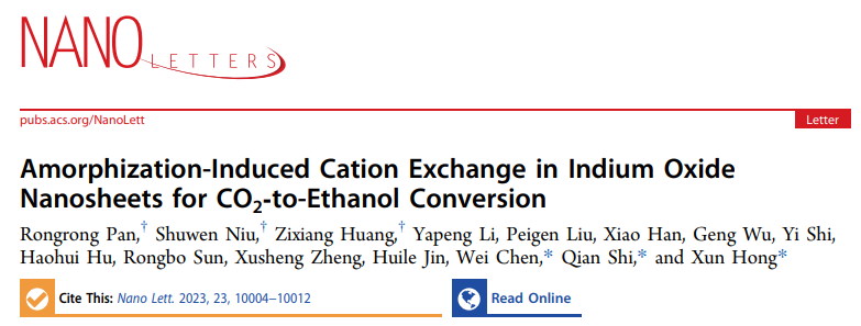 澳门银河官网 化材学院陈伟、时茜教授课题组和中国科学技术大学洪勋教授课题组在国际知名期刊《Nano Letters》发表题为“Amorphization-induced cation exchange in indium oxide nanosheets for CO2-to-ethanol conversion”的论文。该工作在理论计算的指导下,以无定形In2O3纳米片(a-In2O3 NSs)为主体材料,在室温下与多种客体阳离子进行CE反应。密度泛函理论(DFT)计算表明,无定形纳米材料中丰富的配位-不饱和金属位点对于突破CE反应的能垒以调控金属氧化物的组成至关重要。
