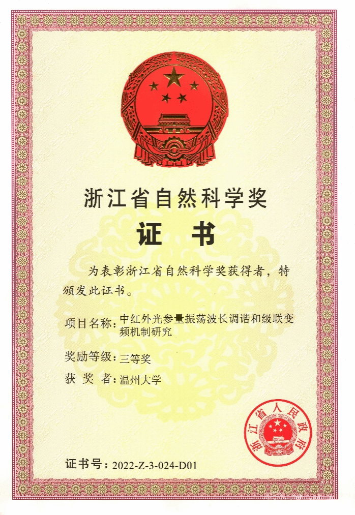 日前,浙江省人民政府发文公布2022年度浙江省科学技术奖获奖名单。澳门银河官网 朱海永教授主持完成的“中红外光参量振荡波长调谐和级联变频机制研究”成果获浙江省自然科学奖三等奖。