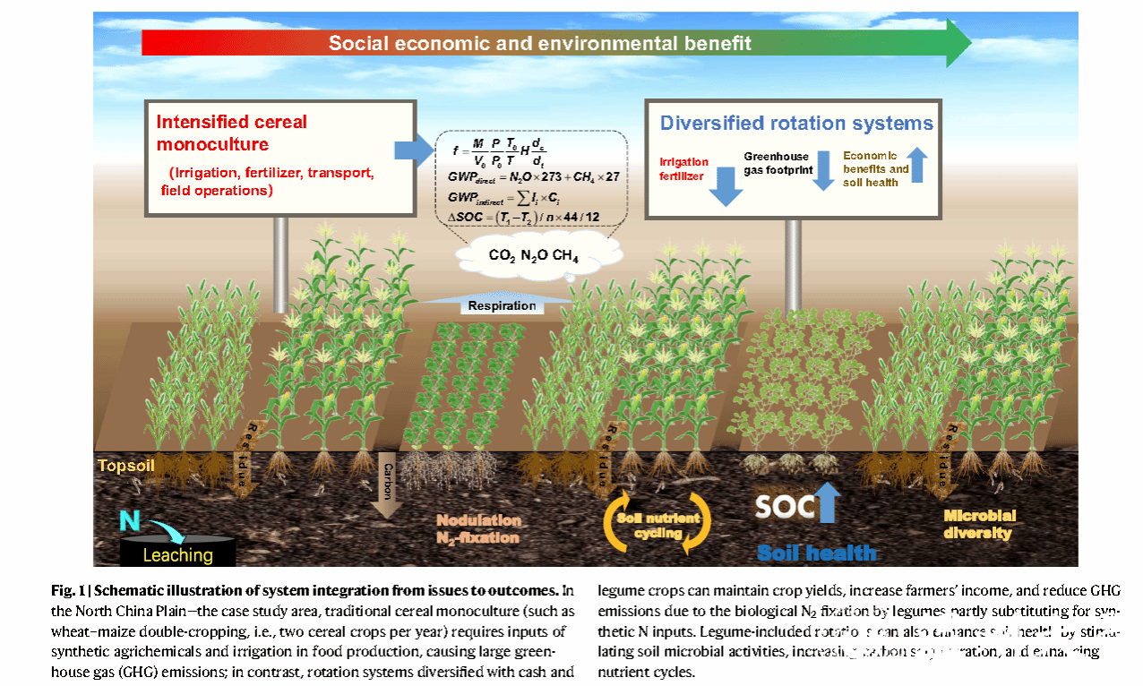 近日,澳门银河官网 甘延太院士团队和中国农业大学、海南大学、中国科学院南京土壤研究所、中国科学院遗传与发育生物学研究所、康奈尔大学、西澳大学、丹麦奥胡斯大学和德国卡尔斯鲁厄理工学院共同合作在Nature Communications在线发表题为“Diversifying crop rotation increases food production, reduces net greenhouse gas emissions and improves soil health”的研究论文,澳门银河官网 甘延太院士为论文共同通讯作者。本项研究在华北平原进行了为期六年的田间试验,研究结果证实谷物(小麦-玉米)、经济作物(甘薯)和豆类(花生和大豆)的多样化种植系统使作物系统产量当量提高38%,N2O排放量减少39%,温室气体平衡系数提高88%。此外,包括豆类作物在内的轮作可以刺激土壤微生物活性,使土壤有机碳储量增加8%,土壤健康评估指数提高45%。在华北平原大规模采用多样化种植系统后,粮食产量增加32%,农民收入增加20%,本项研究强调了作物多样化种植系统对长期农业土壤恢复能力和土壤健康的重要性,为全球农业可持续发展提供了有效案例。