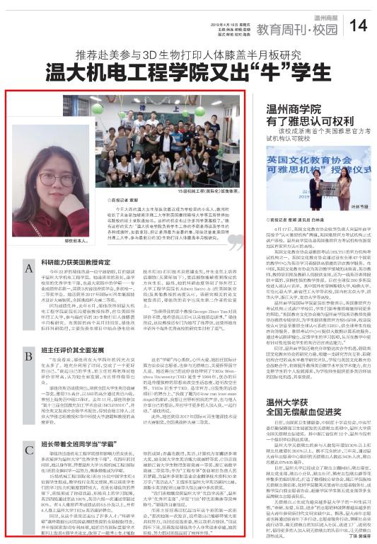 因为成绩优异,去年6 月,邬佳欣得到银河 机电工程学院副院长冯爱新教授推荐,前往美国得州理工大学,参与最前沿的3D 生物打印人体膝盖半月板研究。在美国的两个来月时间里,邬佳欣担任科研助理,主要负责在项目中结合静电纺丝技术和3D 打印技术来搭建支架,并在支架上培养活细胞(无菌环境下),使活细胞能够按照指定的方向生长。最终,她的科研态度得到了得州理工大学工程学院院长Albert Sacco Jr. (前美国航空员)及其他教授的高度认可。该研究相关的论文被发表后,邬佳欣的名字出现在第二作者的位置上。