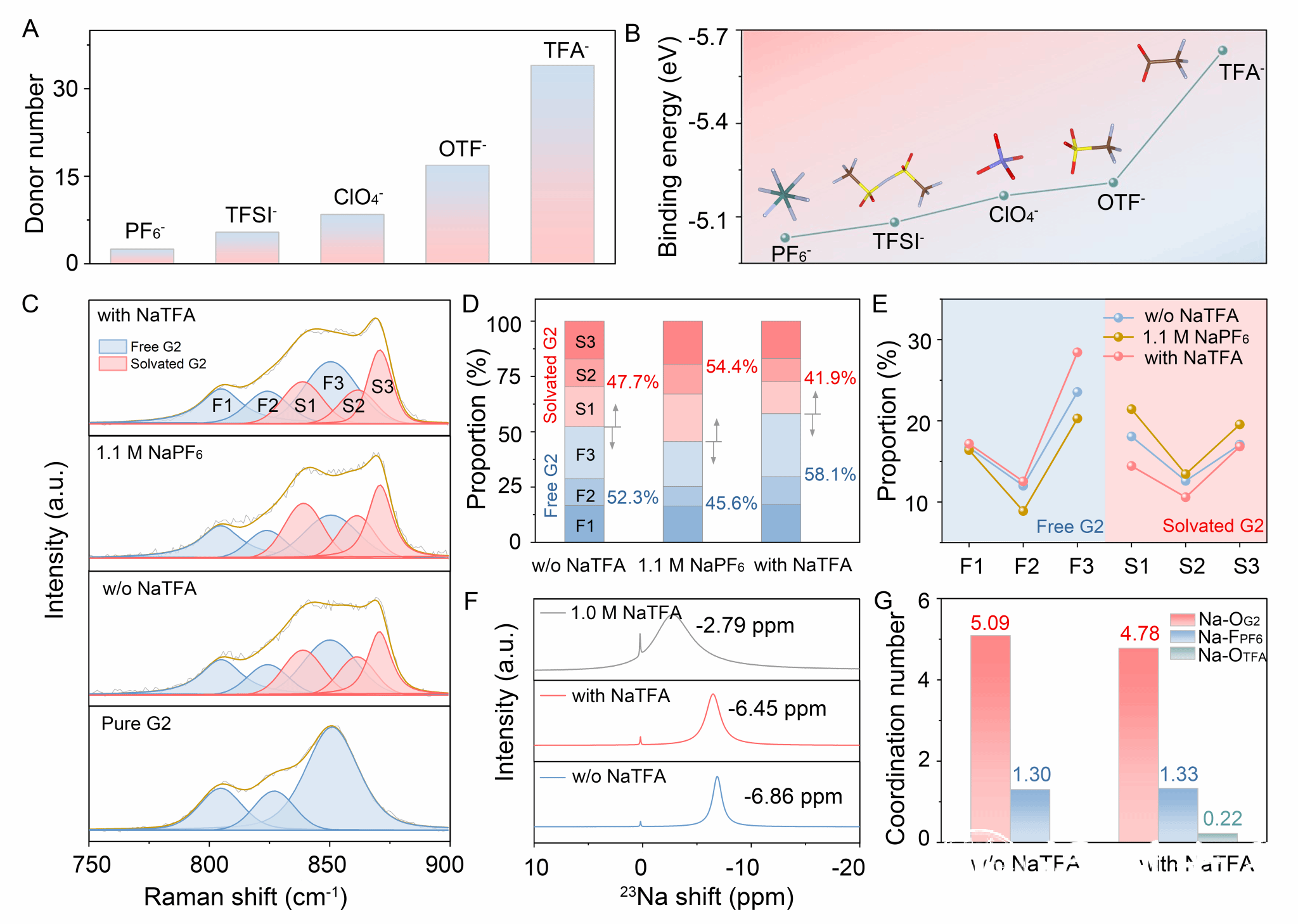 图1. Na+溶剂化化学。(A)常见阴离子的DN值;(B)Na+-阴离子的结合能;(C-E)各电解液Raman谱图及自由G2、配位G2的占比;(F)23Na NMR谱图及(G)各组分配位数
