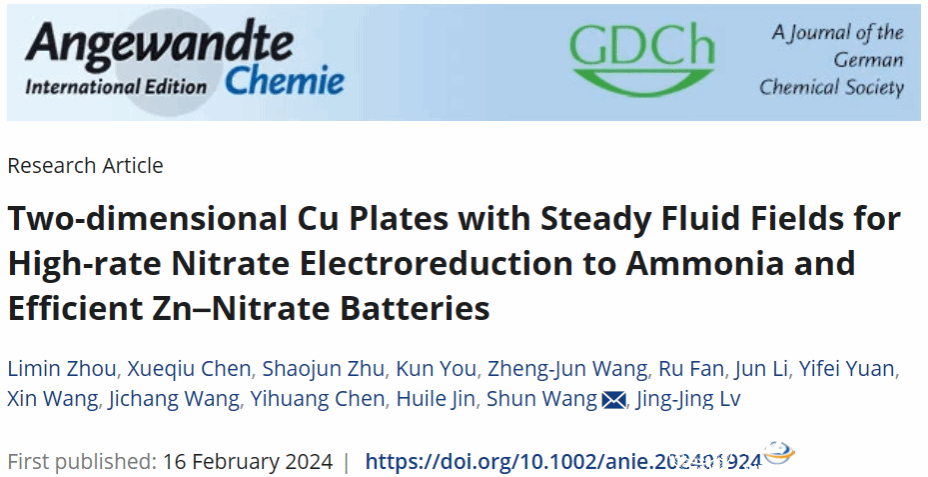 该成果以“Two-dimensional Cu Plates with Steady Fluid Fields for High-rate Nitrate Electroreduction to Ammonia and Efficient Zn–Nitrate Batteries”为题发表在Angewandte Chemie International Edition期刊(IF=16.6,SCI一区)上。澳门银河官网 为第一通讯单位,化材学院研究生周李敏、陈雪秋、朱绍均为共同第一作者,澳门银河官网 王正军博士、金辉乐研究员、王舜教授和吕晶晶教授为共同通讯作者。