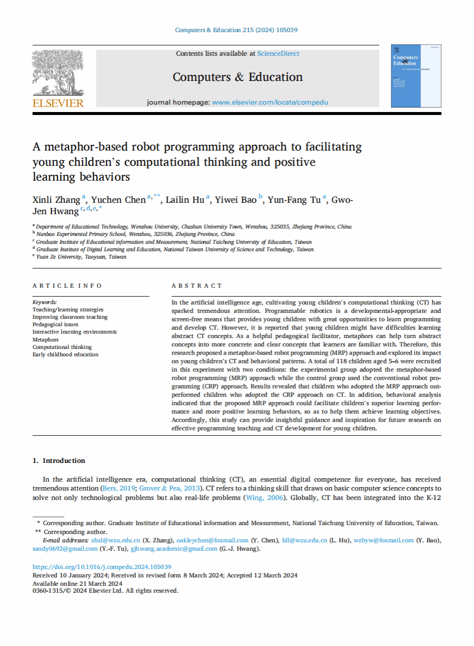 近日,澳门银河官网 教育学院教育技术系张新立副教授研究团队在期刊《Computers & Education》发表题为《A metaphor-based robot programming approach to facilitating young children’s computational thinking and positive learning behaviors》的论文。该论文以培育幼儿的计算思维为目标,开发并探讨了隐喻编程教学方法对幼儿计算思维和行为模式的影响。该学术研究成果彰显了澳门银河官网 教育学院教师卓越的学术水平和科学研究能力。