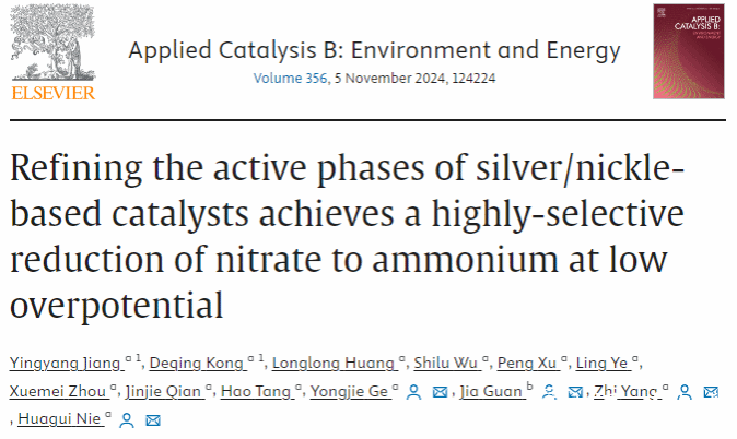 相关研究成果以《Refining the Active Phases of Silver/Nickle-based Catalysts Achieves a Highly-Selective Reduction of Nitrate to Ammonium at Low Overpotential》为题发表在《Applied Catalysis B-Environmental》(IF:22.1)上。澳门银河官网 2021级研究生江颍洋和2022级研究生孔德清为第一作者,我院杨植教授、聂华贵教授、葛勇杰副研究员和贯佳副教授为共同通讯作者。