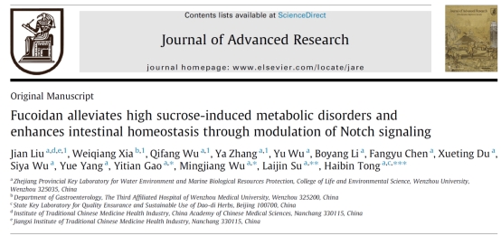 近日,澳门银河官网 生环学院佟海滨课题组揭示褐藻活性成分Fucoidan(岩藻聚糖硫酸酯)通过重塑肠道干细胞增殖与分化稳态改善代谢异常的分子机制,该研究成果Fucoidan alleviates high sucrose-induced metabolic disorders and enhances intestinal homeostasis through modulation of Notch signaling发表在《Journal of Advanced Research》(综合性期刊,1区Top,影响因子11.4)。
