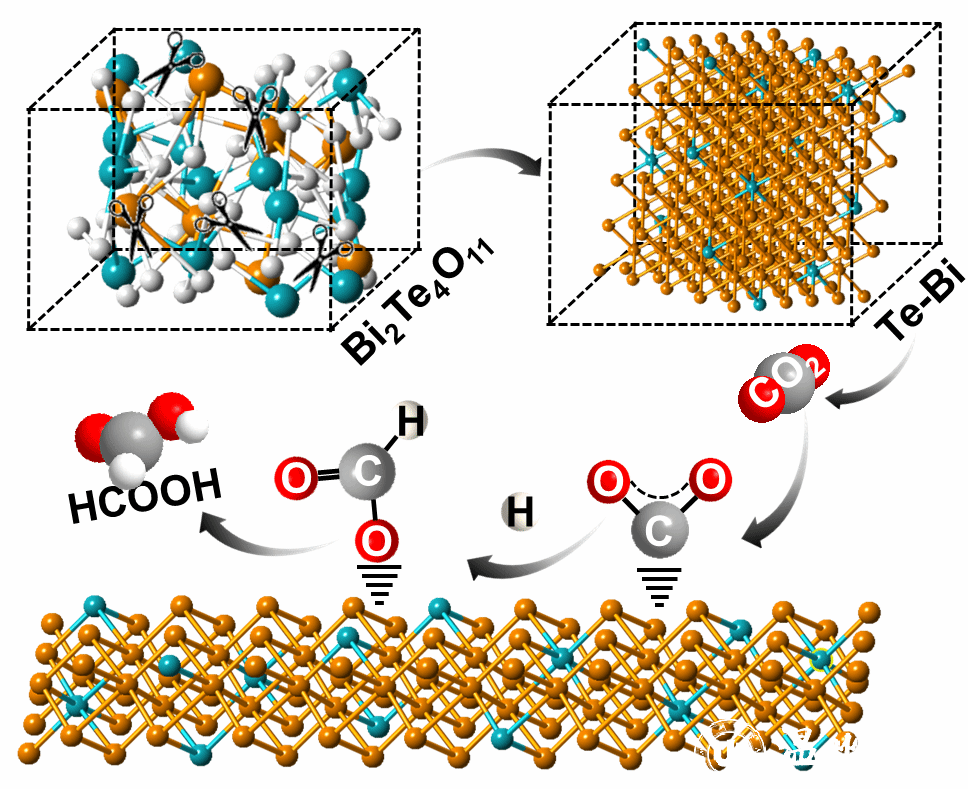 近日,澳门银河官网 王舜/金辉乐/王娟团队在国际顶级期刊《Angew. Chem. Int. Ed.》发表题为“The Reconstruction of Bi2Te4O11 Nanorods for Efficient and pH-universal Electrochemical CO2 Reduction”的论文。在这项工作中,通过在CO2RR条件下原位重构Bi2Te4O11 NRs来开发Te修饰的Bi纳米棒(Te-Bi NRs)。使用原位X射线衍射(XRD)和原位拉曼光谱对CO2RR过程中Bi2Te4O11 NRs的复杂重构过程进行了全面分析。该分析揭示了三个不同的步骤:Bi2Te4O11的分解、Te/Bi相的形成和Te的溶解。Te-Bi NRs在CO2RR中对甲酸盐表现出非常高的性能,在所有pH条件下(酸性、中性和碱性)都表现出优异的选择性和稳定性。具体而言,在中性、碱性和酸性条件下的流动池反应器中,在300 mA cm-2的高电流密度下分别实现了高达94.3%、96.4%和91.0%的HCOOH法拉第效率,超过了工业要求(>200 mA cm-2)。值得注意的是,在这种高电流密度下,可以稳定运行120多个小时。结合了密度泛函理论(DFT)计算和原位红外光谱(ATR-FTIR)全面揭示了Te的存在会使得Bi位点的呈现出缺电子状态,从而增强*OCHO中间体的吸附强度,同时显著抑制竞争性HER和CO的产生。