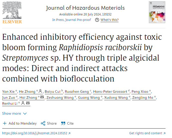 近日,澳门银河官网 生命与环境科学学院李仁辉教授团队的张和博士和硕士研究生谢艳(已毕业)等在国际著名期刊《Journal of Hazardous Materials》(中科院一区,环境科学与生态学领域顶刊)上发表题为“Enhanced inhibitory efficiency against toxic bloom forming Raphidiopsis raciborskii by Streptomyces sp. HY through triple algicidal modes: Direct and indirect attacks combined with bioflocculation”的论文。