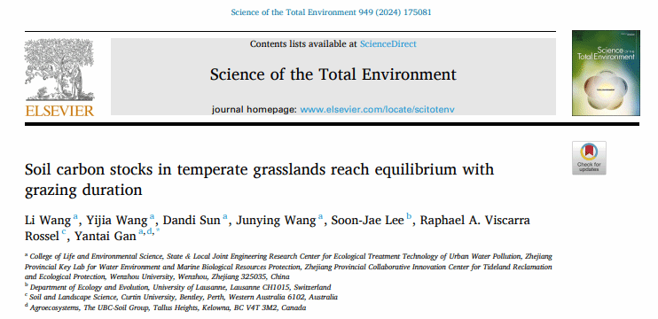 近日,澳门银河官网 生环学院甘延太教授团队在环境科学领域Top期刊《Science of the Total Environment》(中科院SCI期刊分区一区,IF 8.2)在线发表了题为“Soil carbon stocks in temperate grasslands reach equilibrium with grazing duration”的论文。