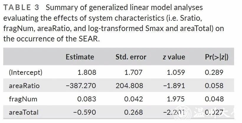 研究结果表明,与物种丰富度与斑块面积之间的正相关关系相反,在控制其他环境因素后,物种均匀度与斑块面积之间存在显著的负相关关系(详见原文中的表1)。
