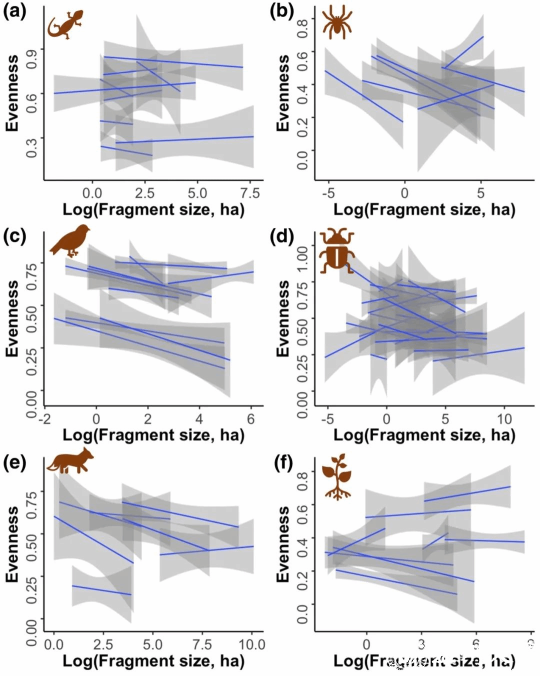 Figure 2 The relationships between the fragment area and species evenness for (a) Amphibia and Squamata (estimate = 0.024, R2 = 0.001, p = 0.788), (b) Arachnida (estimate = −0.309, R2 = 0.291, p = 0.008), (c) Aves(estimate = −0.246, R2 = 0.105, p < 0.001), (d) Insecta(estimate = −0.118, R2 = 0.041, p = 0.027), (e) Mammalia (estimate = −0.263, R2 = 0.123, p = 0.029), (f) Plantae (estimate = −0.049, R2 = 0.005, p = 0.605) when considering each dataset. The grey areas around the curves denote the 95% confidence intervals of the standard deviation (standard error of the estimate) for each dataset. The estimate, marginal R2, and p value were calculated from the generalized linear mixed model when considering all datasets for each taxon.