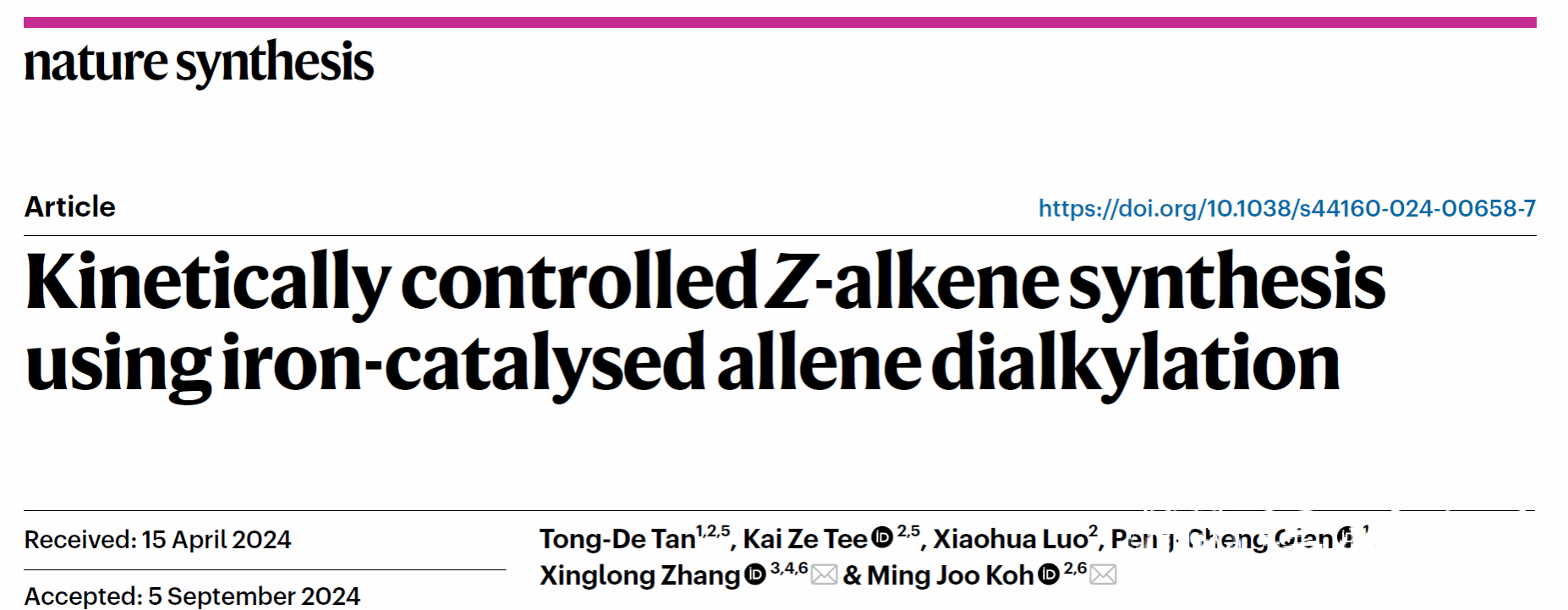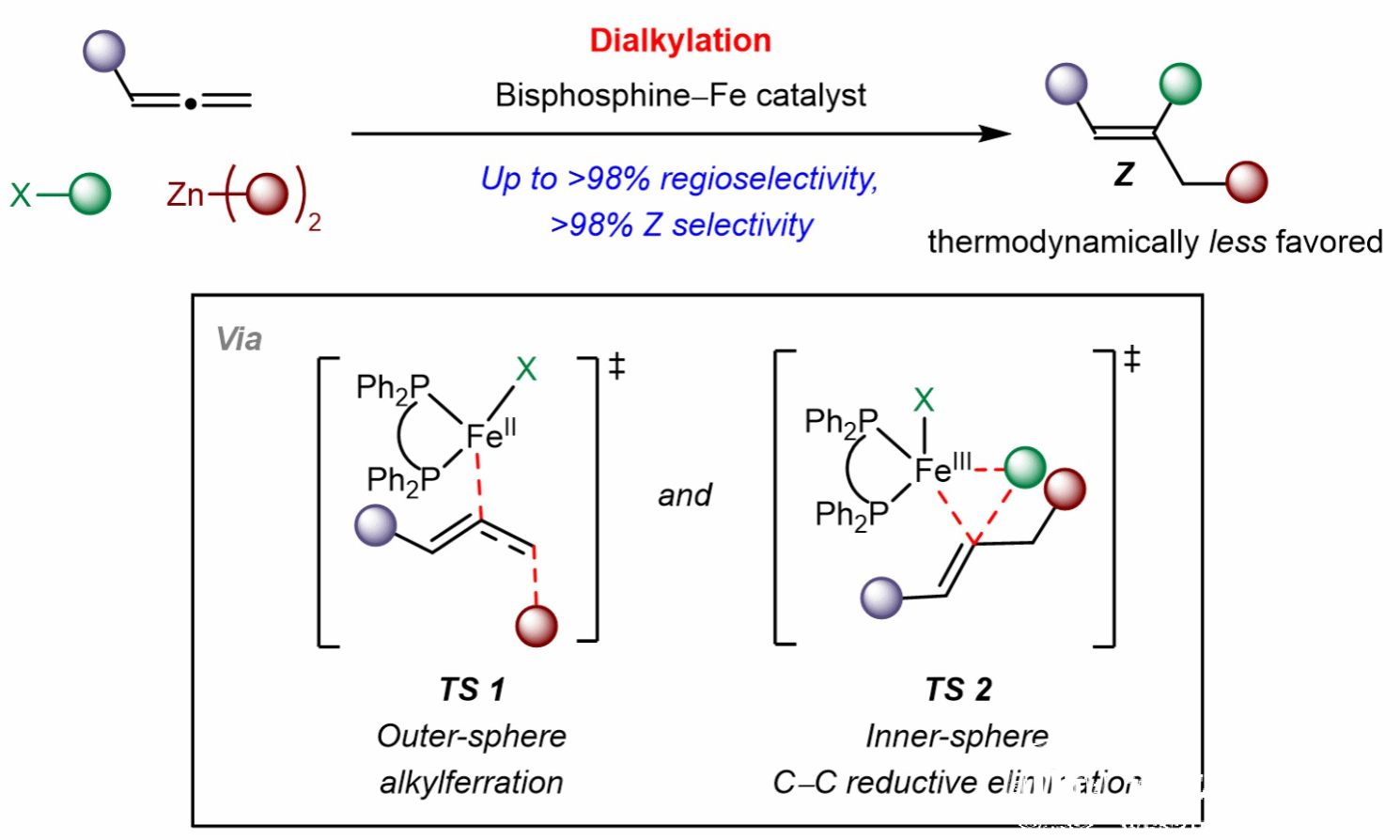 近日,澳门银河官网 钱鹏程教授课题组与新加坡国立大学Ming Joo Koh教授课题组,香港中文大学章兴龙助理教授合作报道了铁催化联烯、二烷基锌化合物和卤代烷烃的多组分反应,以优异的区域选择性和Z-选择性构建了一系列三取代烯烃,包括葡萄糖神经酰胺合成酶(GCS)抑制剂。机理研究表明该反应是由动力学控制的(即自由基介导位阻较小C=C键的铁烷基化和通过还原消除进行的内球烷基化),这与金属催化联烯官能团化反应的传统机制形成鲜明对比。