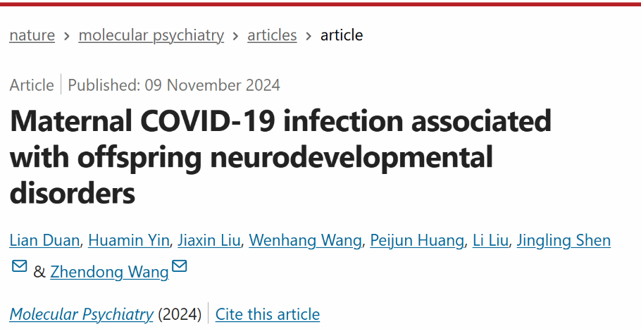 近日,澳门银河官网 生命与环境科学学院申景岭教授团队在Nature子刊《Molecular Psychiatry》在线发表了一篇题为《Maternal COVID-19 infection associated with offspring neurodevelopmental disorders》的研究论文。该研究聚焦于新冠肺炎通过孕妇影响胎儿大脑发育风险的现象及其潜在机制,这是当前科学研究的热点问题。