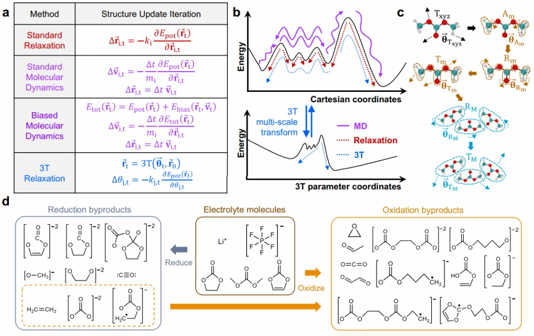 论文介绍了一种名为3T-VASP的新型多尺度梯度能量最小化方法,用于快速从头算电化学反应副产物的生成。研究团队通过该方法在少量从头算能量最小化步骤内成功模拟了复杂的电化学反应过程,显著提高了计算效率,并在锂离子电池电解液中验证了数百种实验已知的电化学副产物。