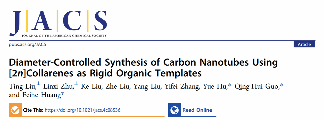 单壁碳纳米管(SWCNTs)因其卓越的理化性质而备受关注。碳纳米管的直径对其性质有着重要影响。因此,直径可控地合成SWCNTs对其实际应用至关重要。利用有机分子为模板实现SWCNTs的生长具有重要价值。首先,其结构明确,有利于SWCNTs的直径可控生长。其次,有机模板避免了金属污染问题。在过去十年中,使用有机模板(如CPP和曲面多环芳烃)生长SWCNTs取得了巨大的进展。然而,高效生长窄直径分布的SWCNTs仍然面临挑战。其中最大的阻碍是缺乏合适的模板分子。分子碳纳米带做为碳纳米管的最小重复单元,其刚性结构为SWCNT生长提供精准模板,有利于SWCNT直径可控制备,因此在碳纳米管生长领域引起了广泛关注。然而迄今为止,利用分子碳纳米带为模板实现SWCNTs的直径可控生长仍未被报道。近日,澳门银河官网 胡悦特聘教授、清华大学郭庆辉副教授、浙江大学黄飞鹤教授合作在该领域实现了突破。