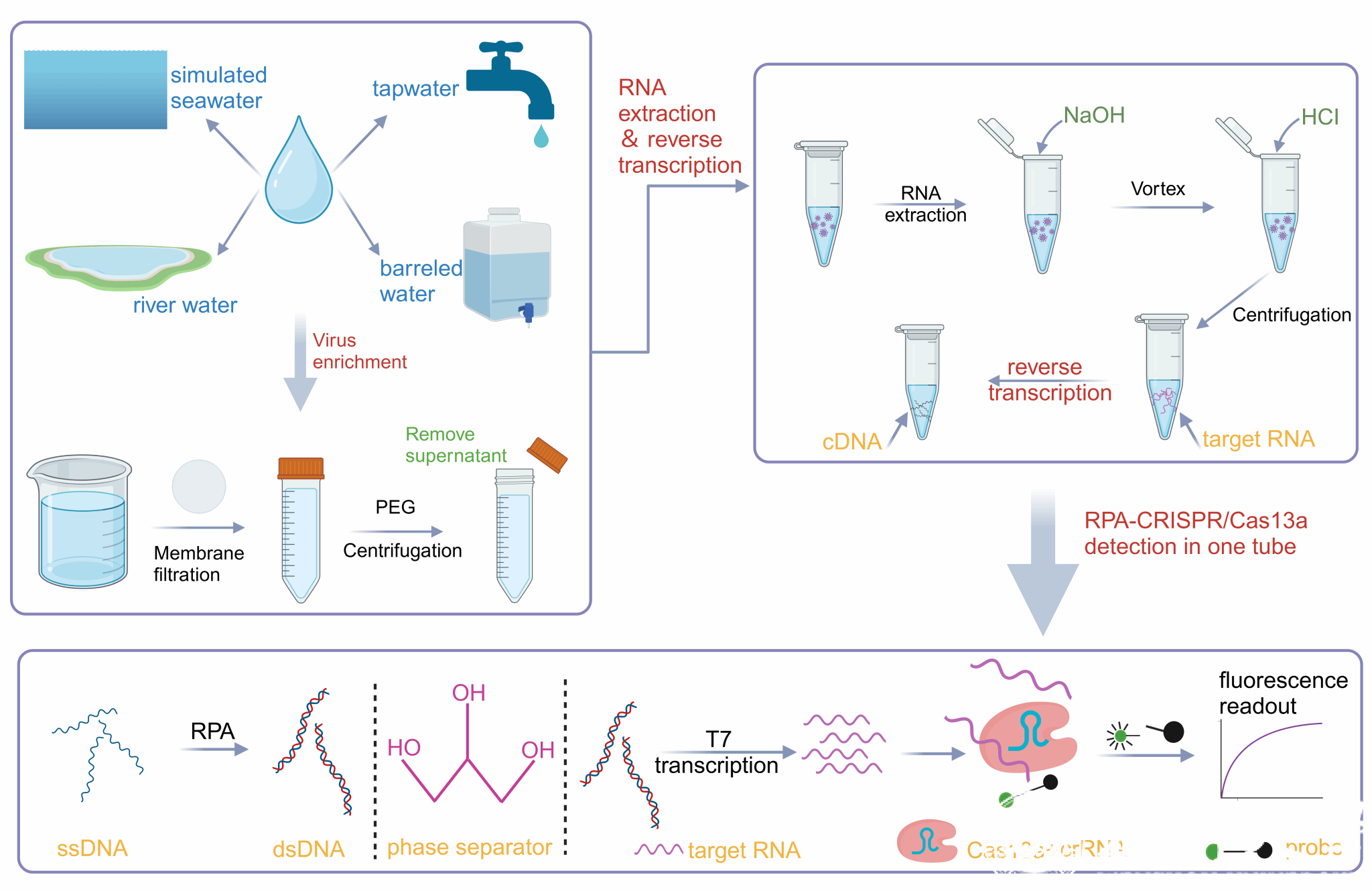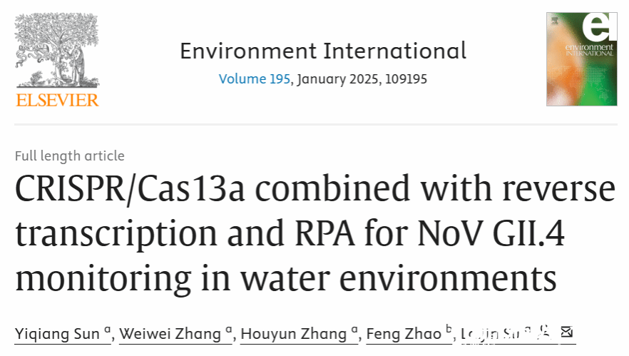 澳门银河官网 生命与环境科学学院吴明江教授团队结合自身优势开展环境毒理和病原检测等交叉研究,取得了系列研究成果。近日,苏来金教授课题组在环境领域著名学术期刊Environmental International杂志上(SCI一区TOP 期刊,IF=10.3)发表了题为“CRISPR/Cas13a combined with reverse transcription and RPA for NoV GⅡ.4 monitoring in water environments”的研究性论文。该论文基于重组酶聚合酶扩增技术(RPA)和CRISPR/Cas13a系统,建立了一种适用于多种水环境、准确可靠、简便快速的GⅡ.4型诺如病毒定量检测方法,该方法在复杂水环境和资源有限地区的诺如病毒快速检测表现出巨大的应用潜力。
