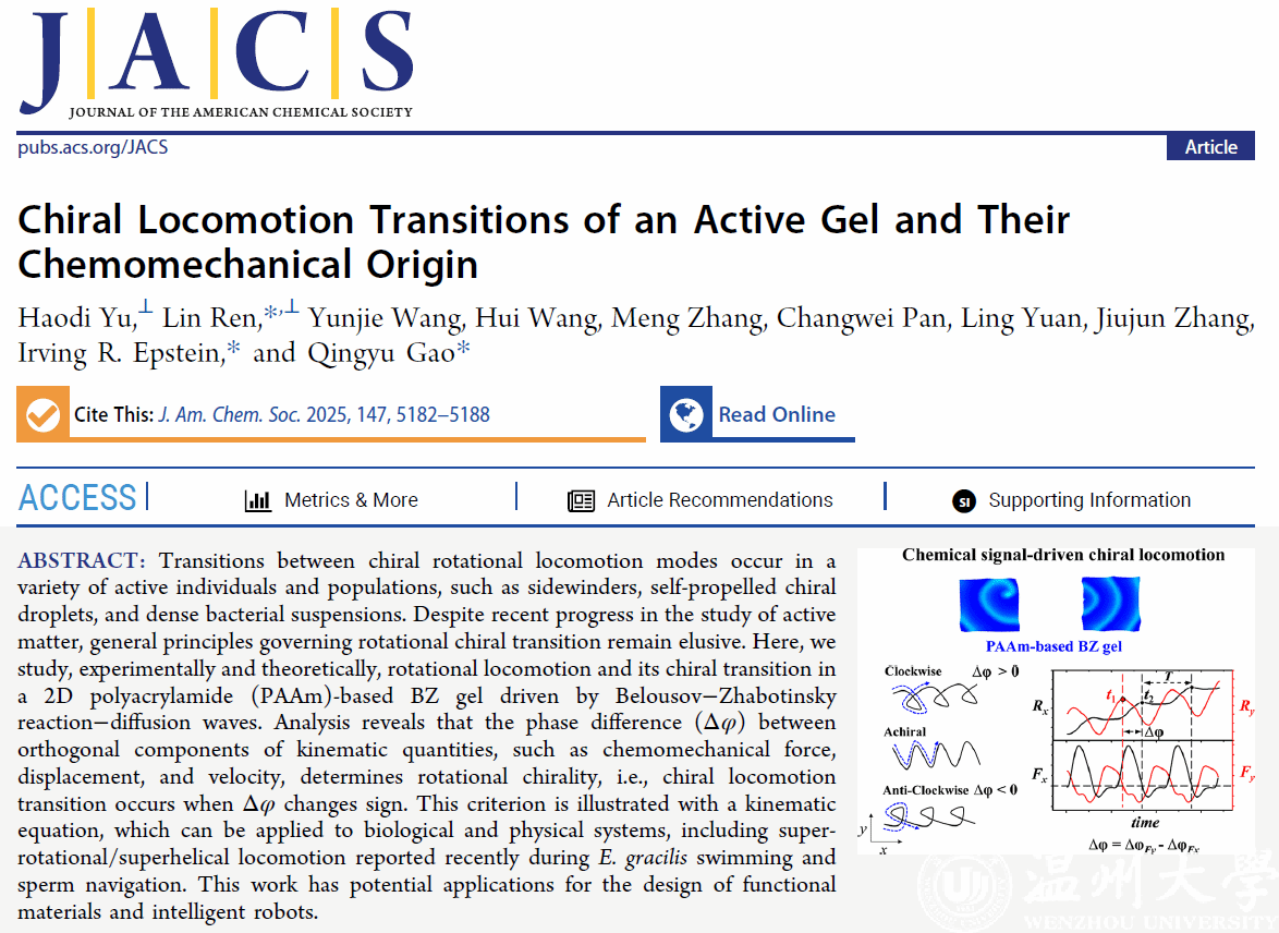 近日,澳门银河官网 化材学院任林教授与中国矿业大学高庆宇教授和美国布兰迪斯大学I.R. Epstein教授紧密合作取得活性运动研究领域重要进展,相关成果以"Chiral Locomotion Transitions of an Active Gel and Their Chemomechanical Origin"为题发表于化学领域顶级期刊Journal of the American Chemical Society。澳门银河官网 为第一通讯单位,澳门银河官网 任林教授、中国矿业大学高庆宇教授和美国布兰迪斯大学I.R. Epstein教授为共同通讯作者。