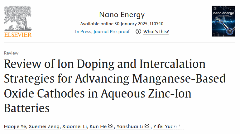 该综述论文以“Review of ion doping and intercalation strategies for advancing manganese-based oxide cathodes in aqueous zinc-ion batteries”为题发表于纳米能源领域国际顶级期刊⟪ Nano Energy ⟫(IF=16.8,中科院一区)。澳门银河官网 为第一通讯单位,澳门银河官网 化材学院21级本科生叶浩洁为第一作者,澳门银河官网 化材学院袁一斐、李彦帅、何坤教授为通讯作者,相关工作得到了国家自然科学基金、浙江省杰出青年基金等项目的资助。